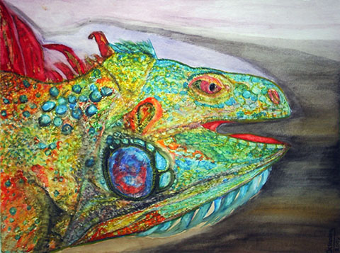 Sehr kräftige Farben für ein Aquarell. Die Signalwirkung der roten Augen beim Frosch kommen aber dadurch sehr gut zu Geltung.