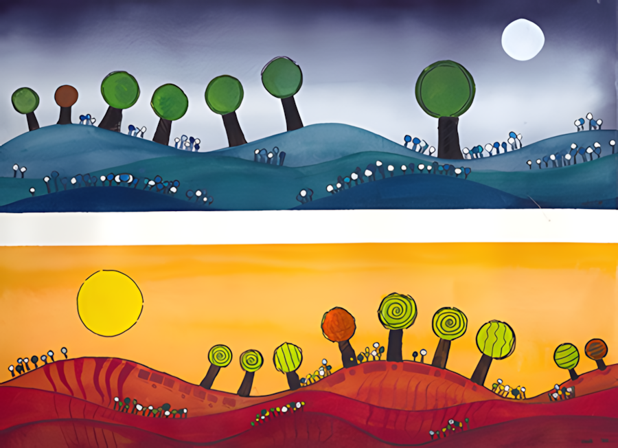 Die Landschaft im Mondlicht wurde mit Komplementärfarben gemalt, wodurch ein harmonischer Farbkontrast entstand.